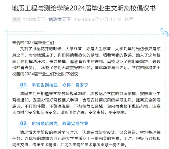 紧密围绕学校2024届毕业生离校教育工作的总体部署,精心策划并实施了多维度、全方位的离校教育体系。通过强化理想信念教育、深化爱校荣校情怀、发挥榜样示范效应、加强安全健康指导以及倡导文明离校风尚,共同编织一幅温馨而庄重的毕业图景,确保每位毕业生在离校之际,不仅能够安全、顺畅地完成各项手续,更能在心灵深处留下深刻的印记,激励他们以地测人的身份,在未来的人生旅途中继续绽放青春光彩,书写辉煌篇章。