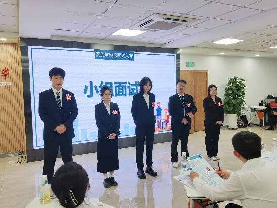 本次决赛分为两个部分:小组面试和无领导小组讨论。在小组面试环节,选手们分组上台,在一分钟时间内,从自身的教育经历、实习经验、求职意向等方面进行自我介绍,评委们则针对选手的简历和自我介绍情况,从专业知识、价值取向、困难应对等方面对选手提出问题,由选手现场作答。在无领导小组讨论环节,选手们在给定的30分钟时间内,根据题目展开讨论,最后按题目要求进行解答汇报。在无领导小组讨论中,参赛选手踊跃参与,各抒己见,勇敢表达自己的观点和想法,经过充分的讨论和酝酿,最终达成共识,向评委团进行汇报。