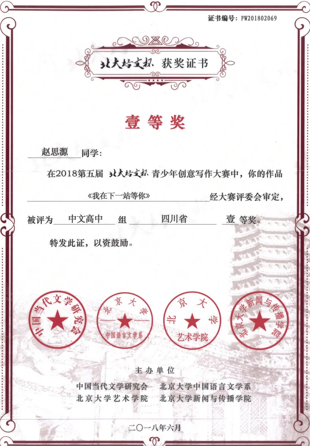 “字语心声,笔尖风雅”。谈及对艺术的热爱,生于书香门第的他从小便与文字结缘:4岁师从著名书法家黄伦先生;5岁开始主持校内外各类文艺活动;7岁开始写诗填词;10岁写下自己第一篇长篇小说(共计2万余字);12岁被列入《四川省首批小作家档案名录》;13岁受邀加入四川省青少年作家协会,成为首批会员;17岁获第五届“北大培文杯”四川省一等奖,并赴北京大学参加现场决赛,获全国三等奖……至此,一颗文学之星正在冉冉升起。