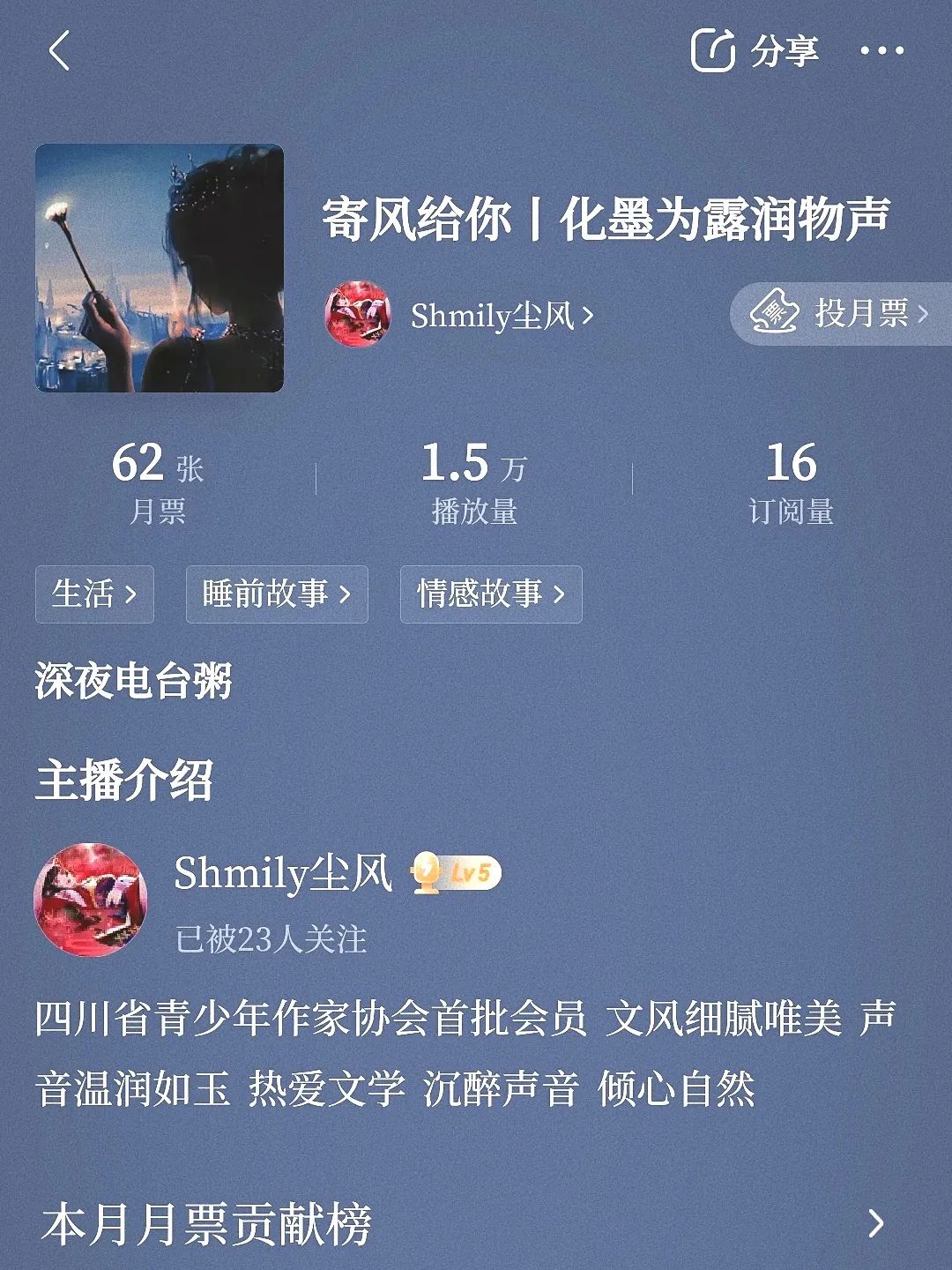 2021年3月,他入驻喜马拉雅广播电台,并陆续上传自己的播音作品于此。所有作品的文案、录音、剪辑、多轨、制作等工序均由他一人包揽。晚间专辑收听率破1.5万,累计收听时长1500小时。从主播到全能的制作者,从听众投稿到自己撰写的唯美散文,在一个个深夜,他用自己温润的声线慰藉着许多失意的人们,也在向大千世界传递着长安的风骨。