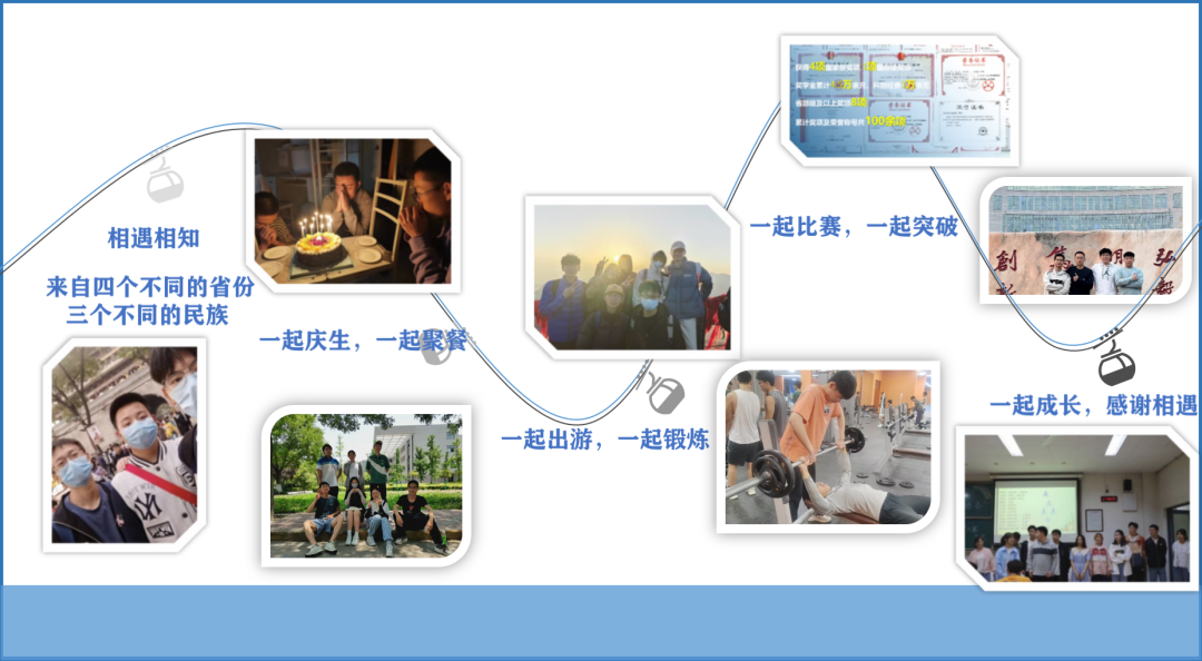在大学期间的集体宿舍学习中,尽管我们来自不同的民族,但我们始终努力奋进,潜心学习、钻研讨论,共同进步,经过三年的努力,宿舍三人获得推免资格,所获奖学金累计4.5万余元;我们亦师亦友初试科创、共同进步,宿舍成员负责六项大学生创新创业训练计划,六项大创全部结项,其中一项评为优秀。另外,宿舍各个成员思想觉悟高,尊敬师长,荣获校级“优秀共青团员”,校级“优秀共青团干部”等荣誉称号;宿舍成员奉献自我,在疫情期间获得参加各项志愿活动累计志愿时长100多小时;我们投身实践,曾前往多家公司进行实习,多次获得“暑期社会实践优秀成果”、“暑期社会实践省级标兵团队”、“暑期社会实践优秀个人”等。除此之外,宿舍成员热爱文体活动,强健体魄,体测通过率100%,荣获文体类竞赛奖项10余项。截止目前,宿舍成员累计奖项及荣誉称号共100余项,其中,国际奖项一项,国家级奖项4项、省级奖项8项。