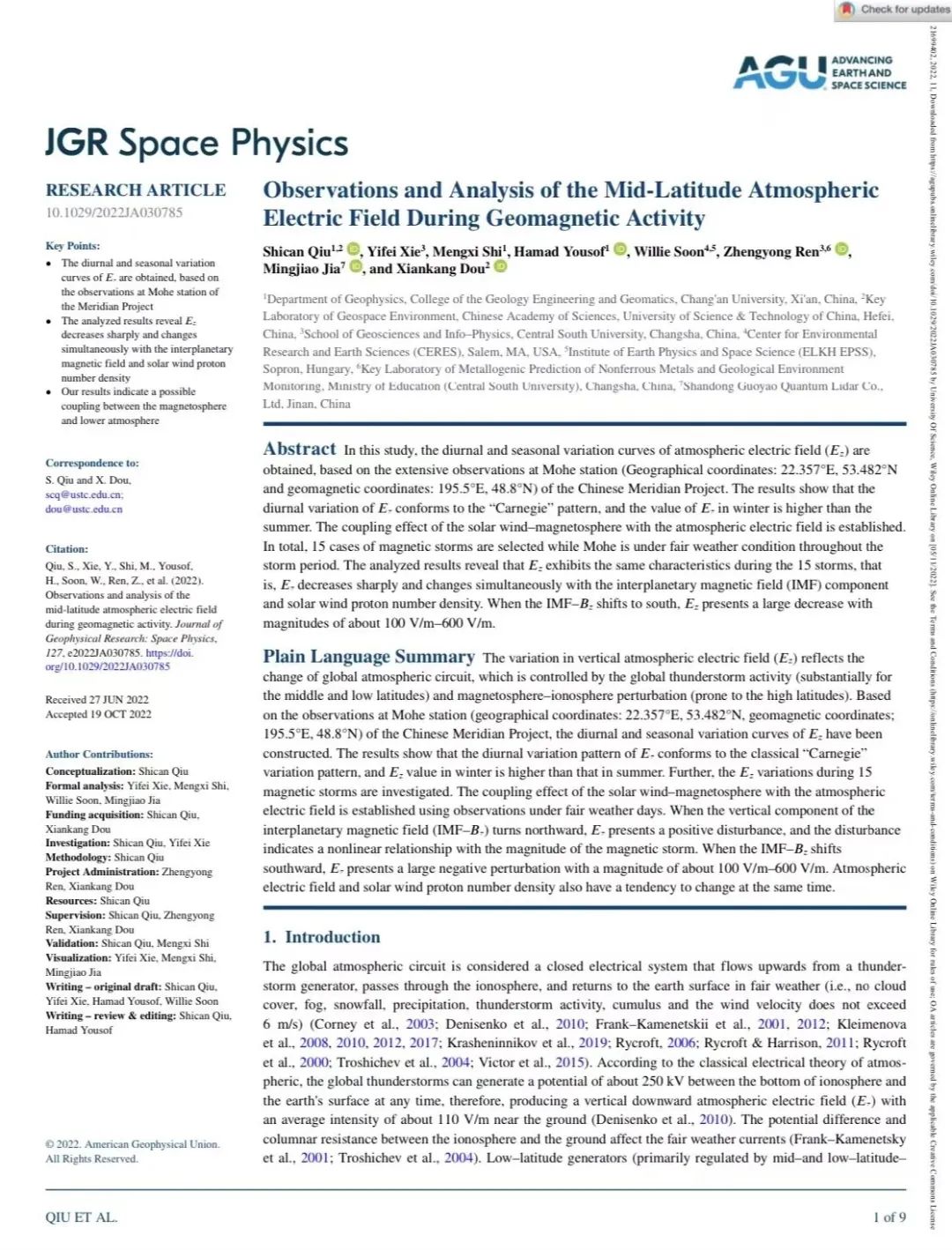 此外,他以第三作者在《Journal of Geophysical Research: Space Physics》上发表的研究论文,表明了垂直大气电场的日变化符合经典的“卡耐基”变化模式,并建立了一种太阳风-磁层与大气电场的耦合效应。