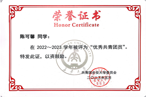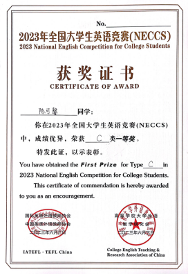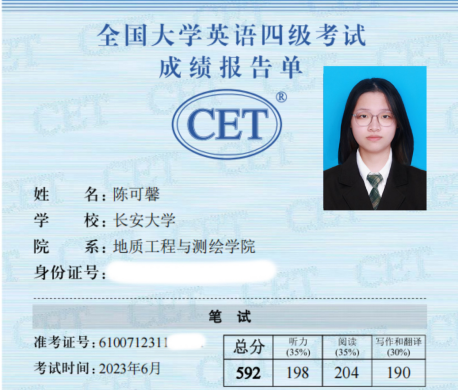 在学习方面,陈可馨制定了合理的学习计划,根据自身情况按照计划完成学习任务,在平时上课的时候认真听讲,如果没跟上老师的思路,她也会在课后通过看书或者听网课补完,至少确保自己对这门课的知识有大致的印象,避免在考试前几天高强度复习甚至是“预习”,影响考试成绩。大学的考试有很多种类型,针对不同类型的考试,她准备的策略也不同。对于理科类考试,她反复做学校下发的复习册、练习题,确保每道题都弄懂、弄会并掌握其背后原理。针对偏重记忆的考试,她选择在考试前一周集中背诵,以免过早开始而产生遗忘。另外,每个人擅长的方面不同,与同学、朋友交流也是很好的学习方式。因为很喜欢在大学遇到的英语老师,陈可馨参加了全国大学生英语竞赛,她从高中时期起就有看美剧听英语的习惯,坚持背单词并利用空闲时间研究真题卷,最终取得了还不错的成绩并以592的高分通过大学英语四级。除此之外,陈可馨还积极参与大创比赛,她在大家激烈的思想碰撞中,感受到了创业型比赛的魅力。