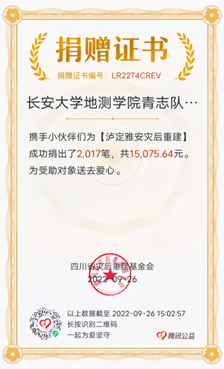 青志队一共成功为四川省灾后重建基金会募集捐款2017笔,共15075.64元。