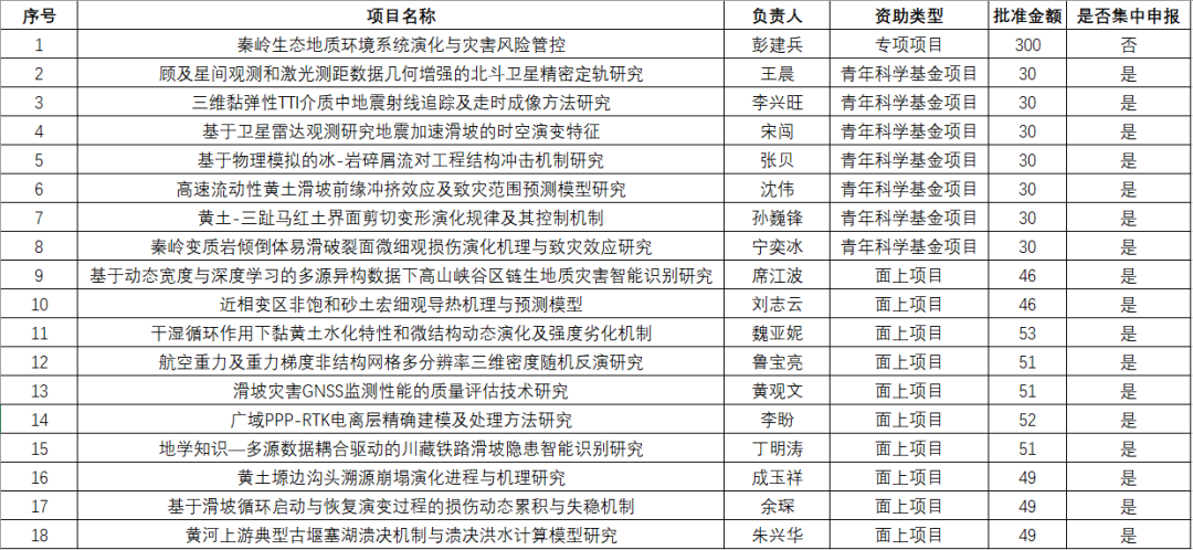 2023年度国家自然科学基金项目共获批18项,彭建兵院士获批重点专项项目1项,集中获批面上项目10项,青年基金项目7项,资助项目经费总额1007万元。