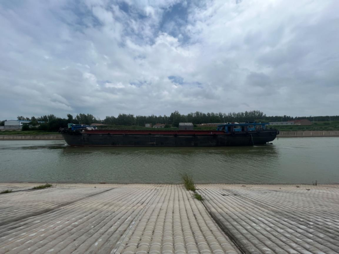 科考人员在京杭大运河山东济宁段与驶过货船合影