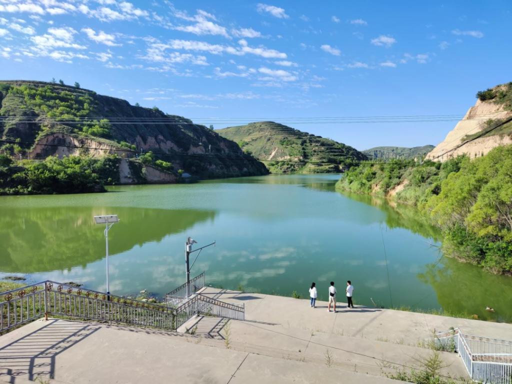 图为实践队成员驻足欣赏山旺庄水库生态绿色美景