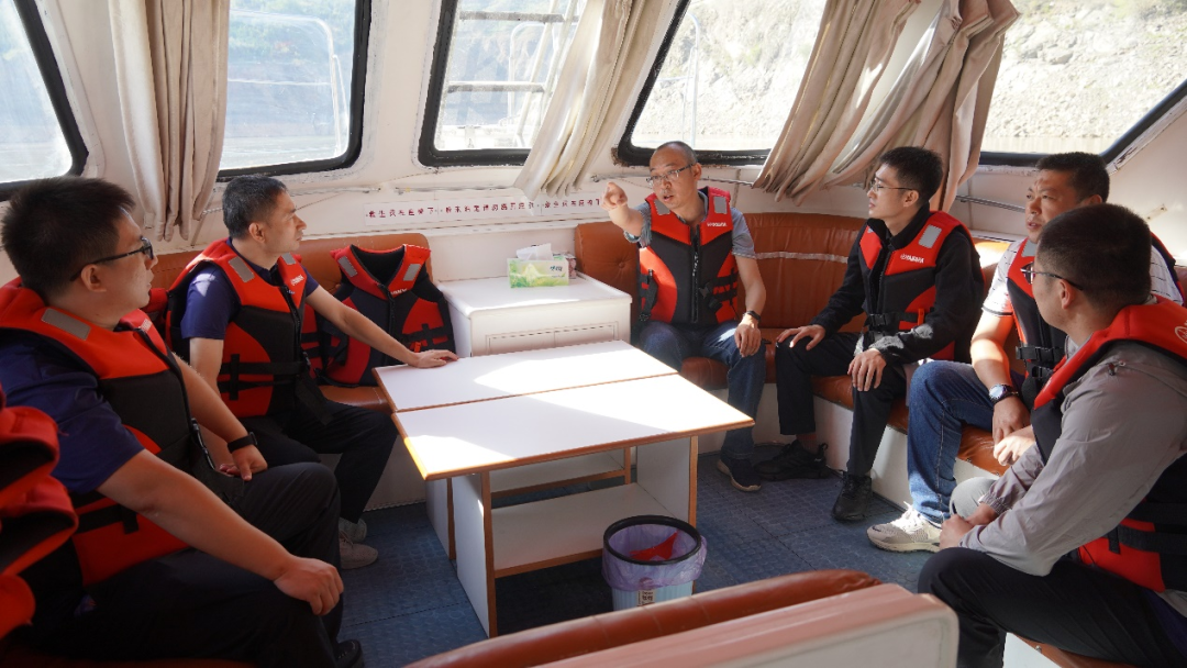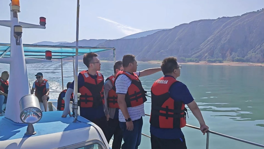 在电厂水工分厂赵主任和张主任的带领下,科考队员登上游船,沿水库逆流而上,近距离考察库区的生态及地质环境、观赏库区壮丽美景。赵主任向科考队简要介绍了刘家峡水库的历史、目前的生产运行情况及库区周边水文地质环境。实践队员认真聆听并记录学习。随后,科考队员深入水电站核心——发电厂房和电厂“大脑”——中央控制室听取陶值长介绍水电站的运行情况。
