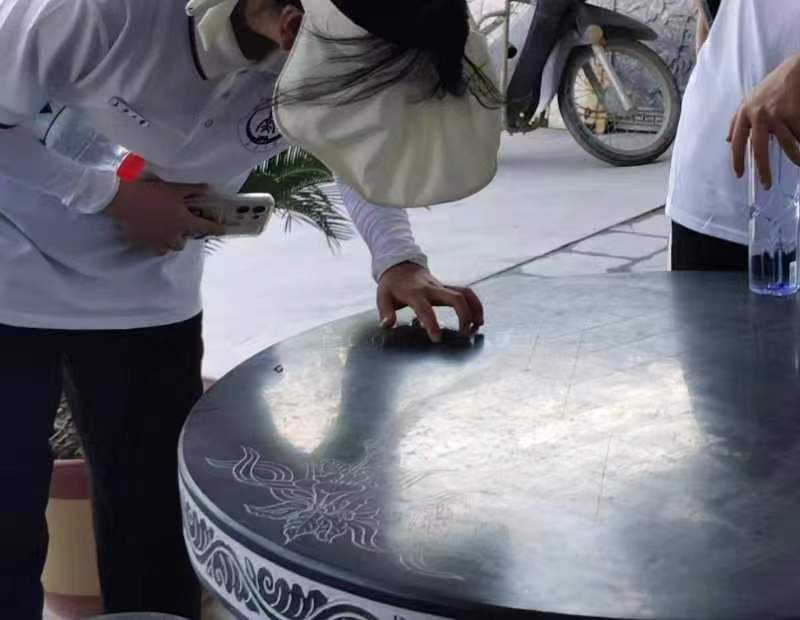 富平石刻分布极广,其中尤以宫里石刻最为闻名,实践队来到宫里镇建材石刻业工会联合会,工会负责人非常热情的欢迎队员们。负责人向队员们介绍了石刻厂的主要营业范围,以及主要特色,其雕刻产品主要有牌楼,砚台,护栏,柱鼎等。选材主要以该县乔山山脉的墨玉石为主,拥有得天独厚的地域优势。随后负责人带实践队参观厂内的雕刻成品,这些成品雕工精细,形式多样,栩栩如生,其制作之精美,深深吸引了实践队员。在此过程中,有工匠正在雕刻一块碑石,成员们在旁观察了其制作的过程,切身体会石刻工匠的一丝不苟,精益求精。实践队在与负责人的交流中了解到,富平作为陕西石刻保护和研究的重点县市之一,全县石刻作坊、企业已达460多家,约有八千工匠从事于这项行业,他们不仅肩负县内石刻产业的发展重任,更是肩负着这项传统文化的传承与发展。然而目前学习这项技艺的人都在35岁以上,技艺的断代问题亟待解决。