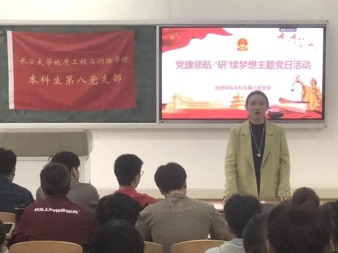 本科生第八党支部于5月11日在鸿远2302教室开展党旗领航·“研”续梦想主题党日活动。学院党委副书记潘迎以普通党员身份参加此次活动,活动由党支部书记余智勇主持。