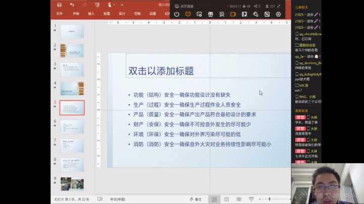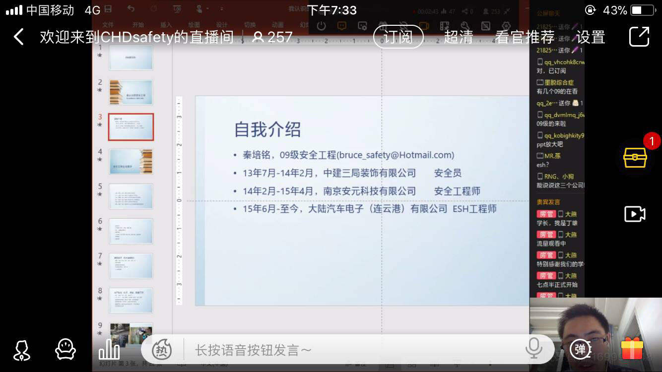 安全工程专业毕业,随后多年间从事安全类工作,曾就职于中建三局装饰有限公司和南京安元科技有限公司。现今在大陆汽车电子有限公司任ESH工程师。随后,他着重对自己的工作内容和就业经验进行了说明,告诫各位同学要在大学的学习生活中丰富自己的专业知识,多学科均衡发展。不仅如此,他还为大家讲述了本专业涉及到的各个行业以及当前国内的就业形势,并且强调身为安全工程人必须具有一定的安全责任意识。直播结尾,秦培铭发起了问答活动,许多同学都提出了各自对本专业的一些问题和迷茫之处。他耐心地对每个问题进行了讲解,并且表示不必拘泥于某个固定的人生发展方向,教导大家确立未来目标的前提是要踏踏实实地走好当下的每一步。希望每位同学都能在大学四年的学习生活中认真努力,勤奋刻苦,最终实现自己的梦想!