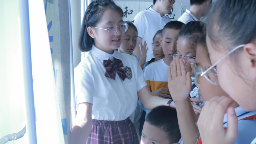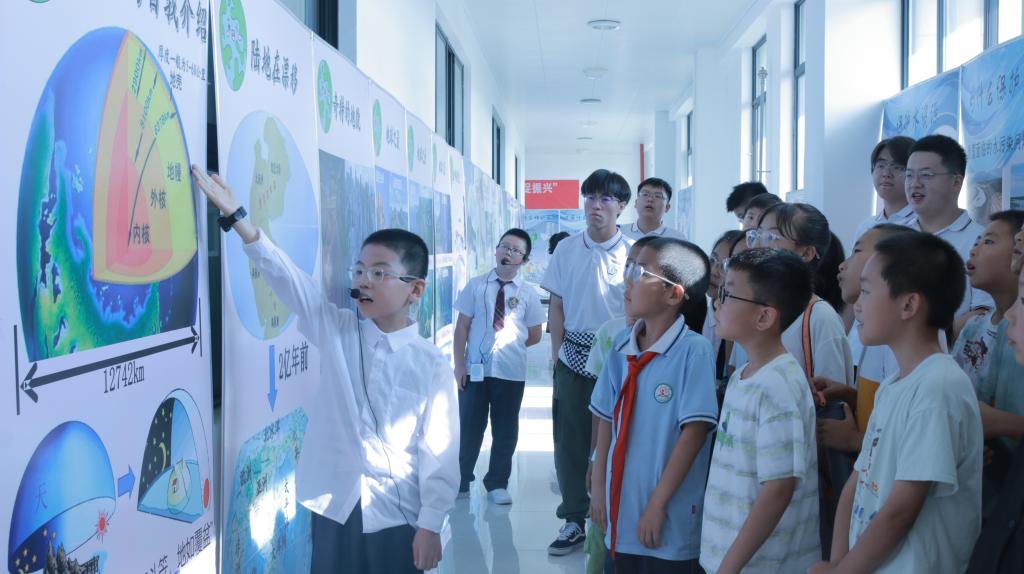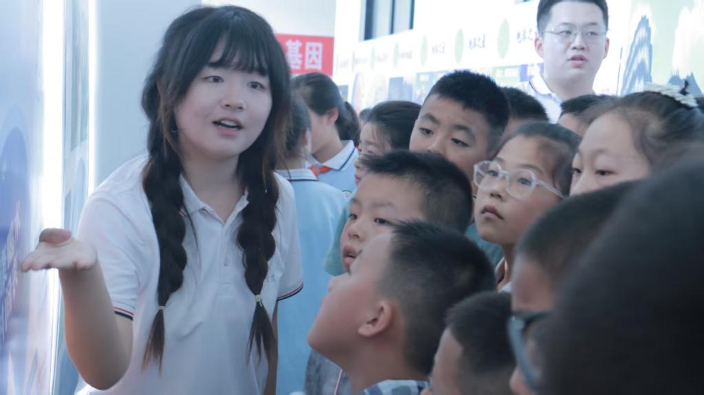 实践队员与北辰小学12名“小小讲解员”并肩而立:大学生以专业知识为基础,辅以图片、数据、真实案例,将抽象概念“翻译”成通俗语言;小学生则接过话筒,独立完成讲解,并主动向观众抛出“知识小问答”——答对者即可领取实践队精心准备的奖品。童声与青年学子的声音此起彼伏,现场互动热烈,展板前人头攒动。