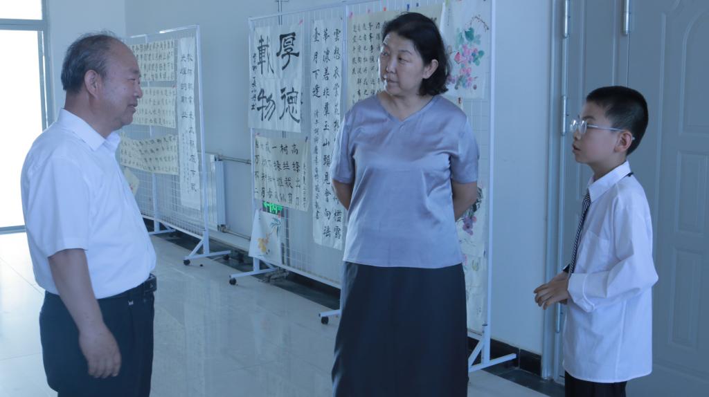 7月14日16:00,实践队指导教师李同录教授、李萍教授走进北辰小学科学实验及展板讲解区域,实地慰问“小小讲解员”,并与之展开科学对话。