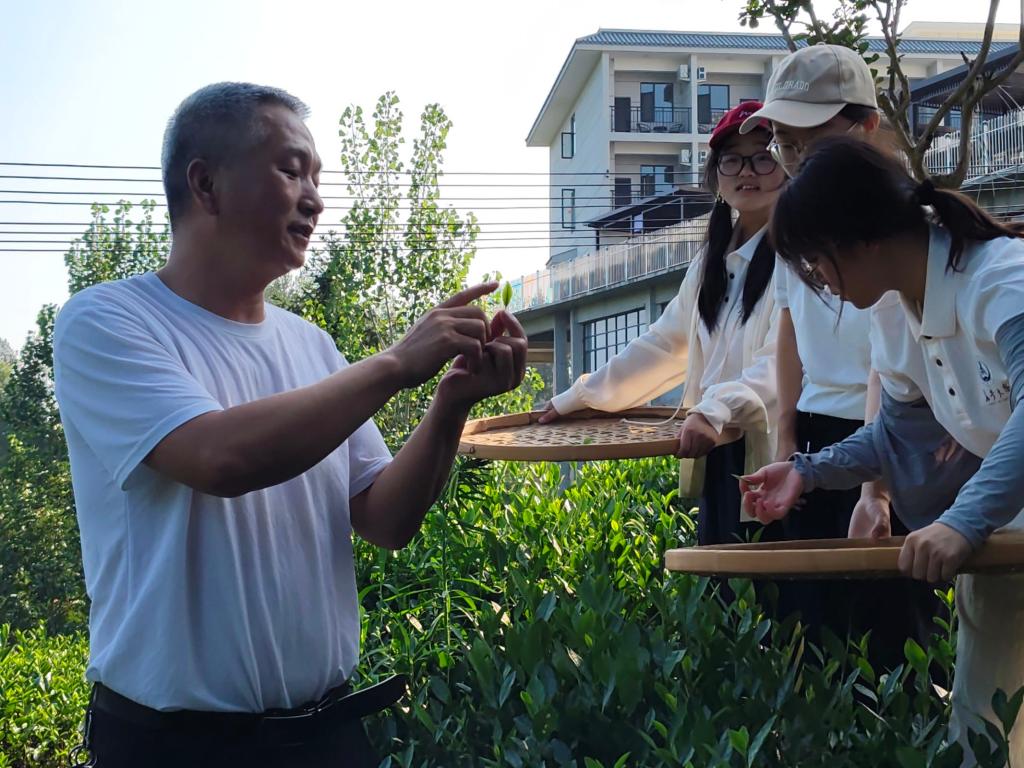 赴陕西商南“秦风益路・志合商南”暑期社会实践队走进商南县茶叶联营公司,继昨日参观茶叶加工厂和对公司法人陈洪涛进行访谈后,沉浸式体验茶叶种植、手工制作流程,于茶香氤氲中感受传统技艺的传承与乡村产业的活力。