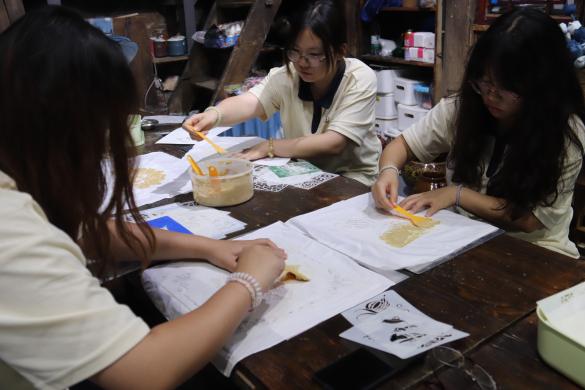 在非遗传承人张婷婷老师的带领下,实践队员体验布依族独特的豆染技艺,她细致示范基本工具使用方法以及制作工序。随后,队员们与张婷婷老师一起制作方巾,队员们在豆染的过程中深切体悟了传统非遗豆染的匠心独运,坚定了保护与发扬非遗传统文化的信念。
