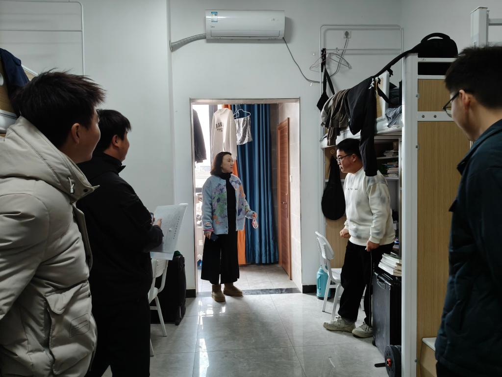 走访过程中,老师们细致查看宿舍用电安全及消防通道状况,对发现的问题现场提出整改意见,强调要杜绝违规电器、保持通道畅通。围绕“构建文明安全宿舍环境”主题,老师们叮嘱同学们自觉遵守宿舍管理规定,增强安全防范意识,共同维护整洁、和谐、有序的生活空间。