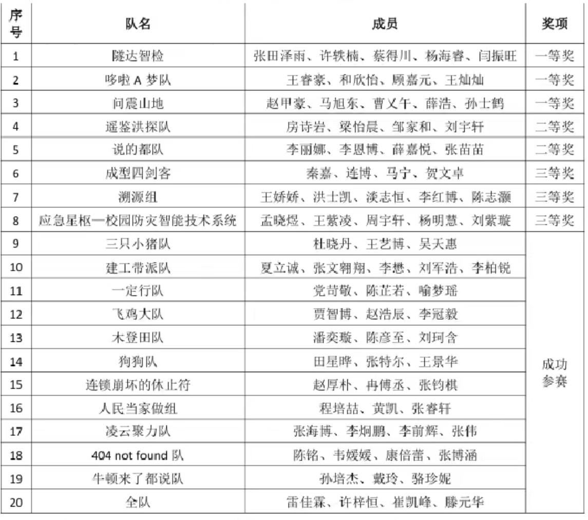 本届比赛聚焦理论知识向实操能力的转化,参赛队伍需要运用自己的专业知识,激发创新潜能,设计出独具特色的防灾减灾方案,同时完成并提交报名表和技术方案设计书。其中,团队需要在技术方案设计书中明确项目摘要、技术方案、可行性分析并说明目标预期。最终,从创新性、可行性、现实意义等方面对参赛作品进行综合评分。评审结束后,地测科协对评审结果进行汇总,共评出一、二、三等奖共八支队伍,获奖名单如下: