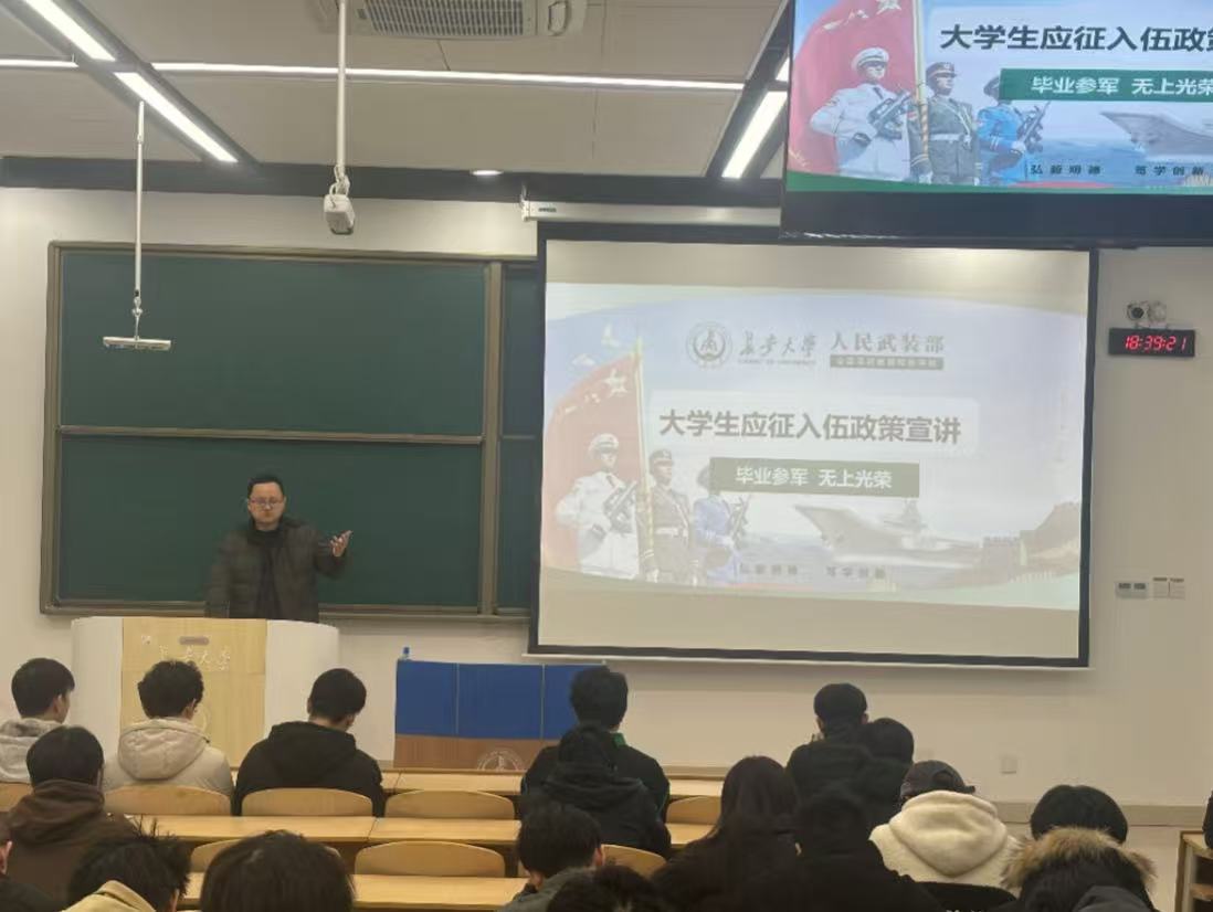 宣讲会上,李武军结合自身军旅经历,系统介绍了“为什么参军入伍”、“参军入伍有哪些优待政策”,以及毕业生怎样才能参军入伍等一系列问题,重点详解了报名条件、体检政审、手续办理等关键环节,以实际经验让政策解读更接地气。针对涉及学生切身权益的保障问题,他全面解读了多重优待政策:国家层面的学费补偿、义务兵津贴及特殊岗位补贴,退役后的考研加分、就业定向招录等政策,以及军衔认定、复学流程、就业帮扶等核心权益,让学生对参军福利有了全方位认知。