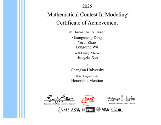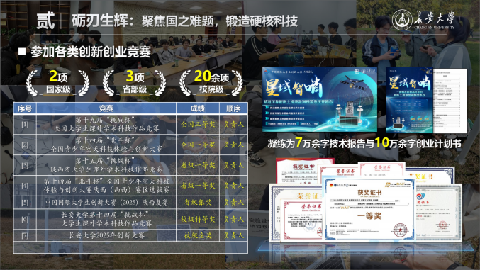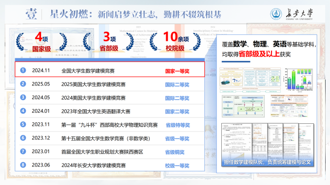 他坚持以高水平学科竞赛锤炼跨学科能力,作为队长斩获2024年全国大学生数学建模竞赛全国一等奖(近两届全校唯一)、第十九届“挑战杯”课外赛主体赛全国三等奖,并获得第十四届“北斗杯”全国一等奖(本科组赛道全国唯一),刷新学校在该赛事中的历史最好成绩。团队也荣获“长大标兵奖·长大之星(团队)”荣誉称号。