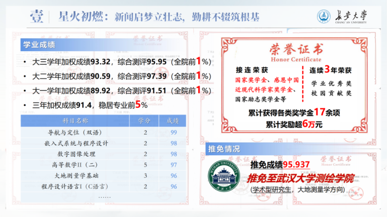后,他珍惜来之不易的求学机会,借助生源地助学贷款完成学业,也把全部热情投入到学习中。大三学年,他的加权成绩达到93.32,综合测评95.95,位列学院前1%,先后获得国家奖学金、感恩中国近现代科学家奖学金等各类奖学金17项,累计金额6万余元,并成功推免至武汉大学继续深造。