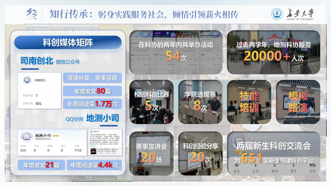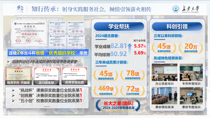 大学生科技创新创业协会执行主席,他始终以“不做青年‘官’,要做青年友”为准则,以服务同学、赋能集体为己任,策划组织科创活动54场,覆盖师生2万余人次,系统推进赛事培训、项目孵化与成果展示,助力学院在“挑战杯”“北斗杯”等重要赛事中屡创佳绩。地测科协获评“长大标兵奖·长大之星(团队)提名奖”、“活力团支部”等荣誉,他本人也荣获“共青团标兵”等多项荣誉称号。