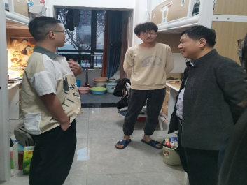 地球物理系主任包乾宗、系副主任纪新林、教师代表胡景、董怀民和2019级辅导员侯梦阳走访了本科生宿舍,与学生深入交谈,倾听学生心声,帮助解决学生诉求。
