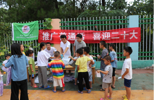 实践队员在临时推普站点进行推普宣传工作