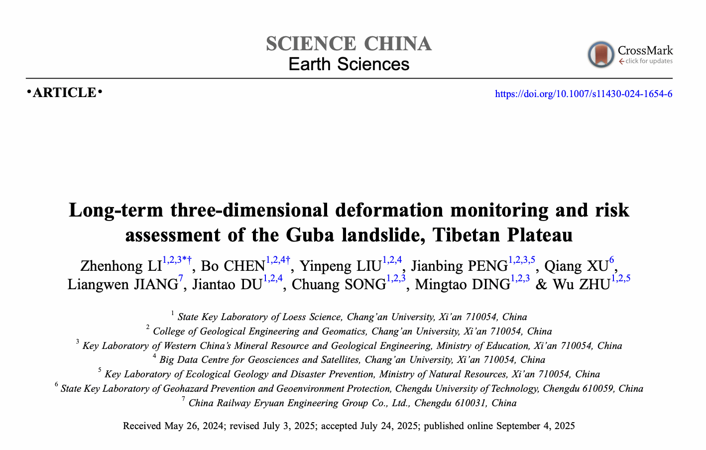 李振洪教授团队与成都理工大学许强教授、中铁二院蒋良文副总工程师合作,在人迹罕至高位远程滑坡长时序三维监测和风险评估方面取得新进展。相关研究成果以“青藏高原古巴滑坡长时序三维形变监测和风险评估”为题,于2025年9月3日发表于《中国科学:地球科学》(Science China Earth Sciences)杂志,通讯作者为17直播