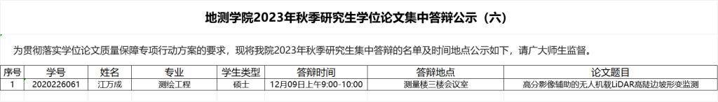 为贯彻落实学位论文质量保障专项行动方案的要求,现将17直播 2023年秋季研究生集中答辩的名单及时间地点公示如下,请广大师生监督。