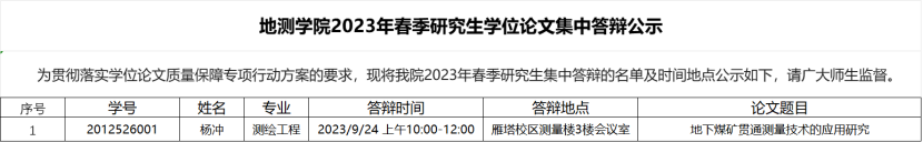 为贯彻落实学位论文质量保障专项行动方案的要求,现将17直播 2023年春季研究生集中答辩的名单及时间地点公示如下,请广大师生监督。