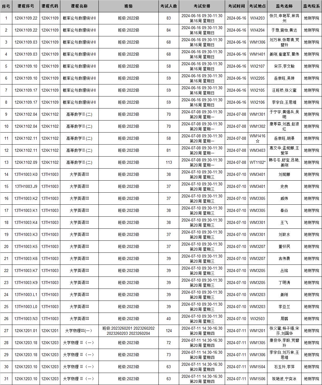 本学期公共课期末考试周考试、概率论与数理统计期末考试监考安排已发布,监考安排学院已经在本科教务系统中填报完成(监考教师可同时在本科教务系统中查看监考安排)。为确保考试平稳顺利进行,学院已将相关监考工作安排表格上传到附件中,请各位老师及时下载查阅,并按时完成监考工作。