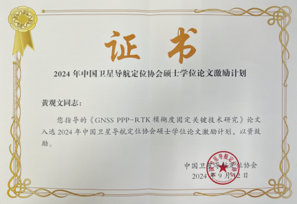 2022届硕士研究生杜石的学位论文《GNSS PPP-RTK模糊度固定关键技术研究》成功入选2024年度中国卫星导航定位协会硕士学位论文激励计划,指导老师为黄观文教授。