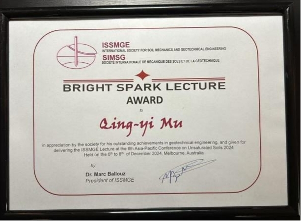 穆青翼教授荣获国际土力学与岩土工程学会(International Society of Soil Mechanics and Geotechnical Engineering,ISSMGE)颁发的“未来之星奖”(Bright Spark Lecture Award)