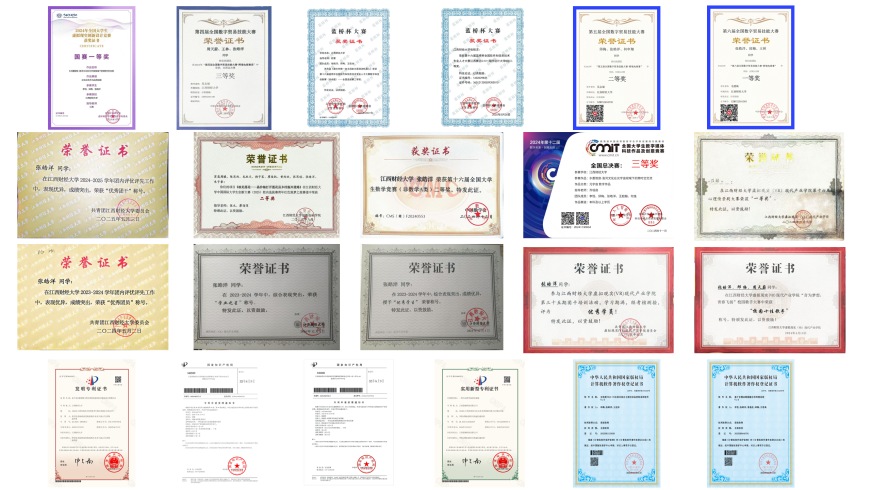 “志不求易者成,事不避难者进。”在学科竞赛的舞台上,张皓洋始终以高标准要求自己,凭借扎实的专业知识和高效的团队协作能力,屡创佳绩,获中国国际大学生创新大赛(2025)国家级银奖、虚拟现实创新设计竞赛国赛一等奖、全国数字贸易技能大赛国家级一等奖等共计6项国家级奖项,省校级奖项20余项。
