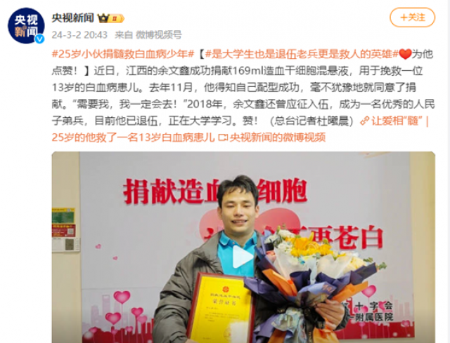 报道指出,近日,我院余文鑫在南昌大学第一附属医院为一名陌生白血病患儿成功捐献造血干细胞混悬液169ml,成为全国第16973例,江西省第328例造血干细胞捐献者,也是江西省龙年第2例。